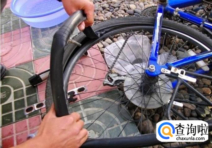取出内胎后把气门安好,然后打气,把内胎放在水里,看看哪里冒泡,就可以确定内胎哪里坏了,然后用锉把外边那层旧的橡胶磨掉,然后贴上粘合胶片,压紧。
