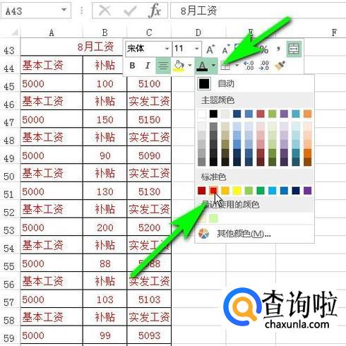也可以鼠标在表格上右击,弹出工具栏,再点击设置字体颜色按钮,在弹出的面板中选择红色。
