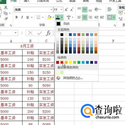 在弹出的面板中,选择红色;那么,整个表格的字都变成了红色。