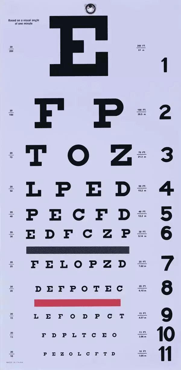 “E表”并不是所有国家都在用,美国现在还在沿用的“Snellen chart”,它是由各种拉丁字母组成的,是最初版本的视力表。