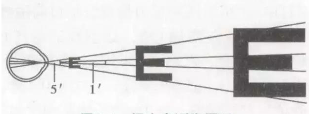 我们常用的“E”字视力表,是根据视角原理设计的,用一个公式表达,即V=1/a 表示视力,a就是视角