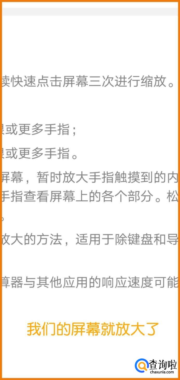 如果我们要继续放大屏幕,两指向两端滑动可放大屏幕。