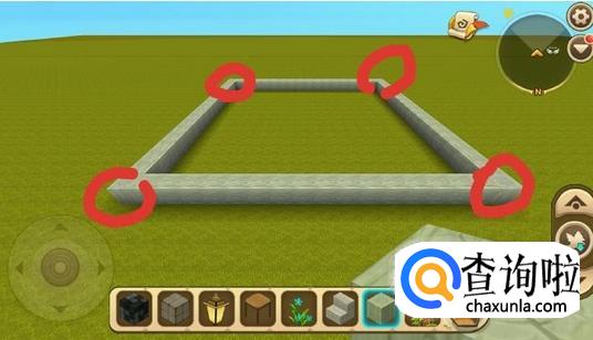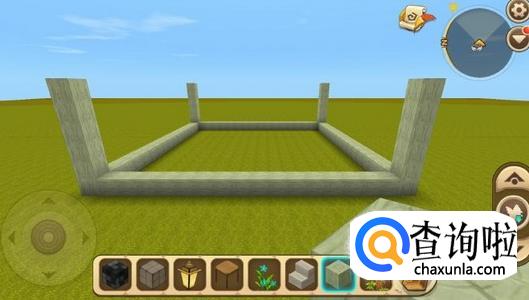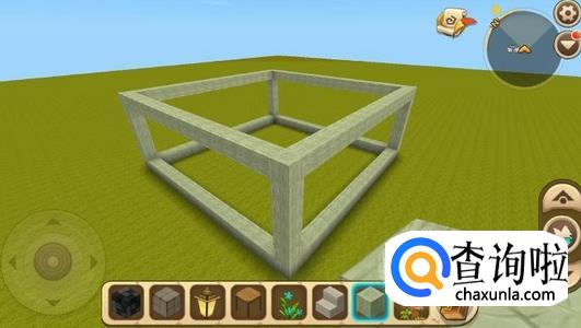 在基底四个角上面分别在放7个方块,以柱子为基础,用小方块搭出具体的框架,并用玻璃补充好框架间空余的面。