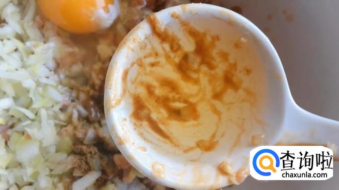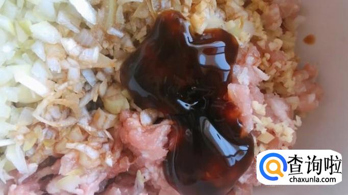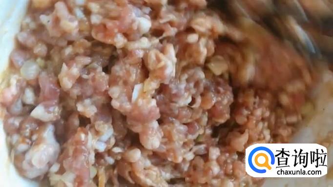 用筷子搅拌肉馅,按同一方向快速搅拌,使肉馅紧致、均匀。