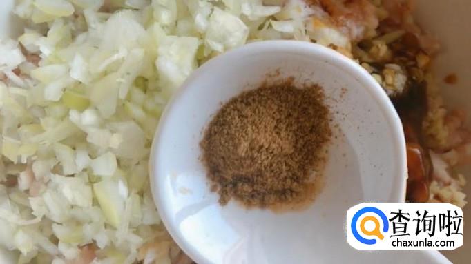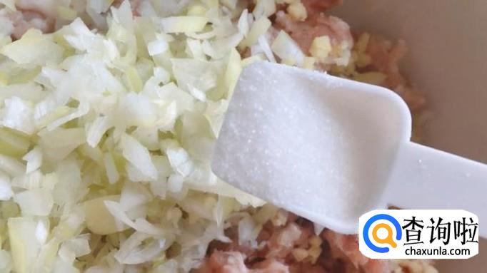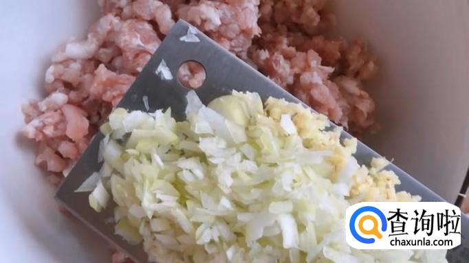 将准备好的猪肉糜放入碗中,葱、姜末也加入碗中。