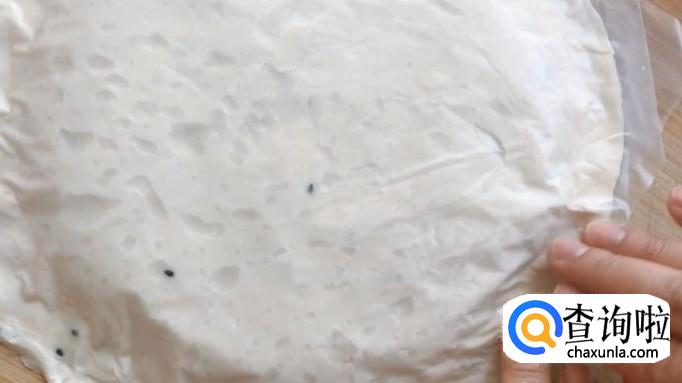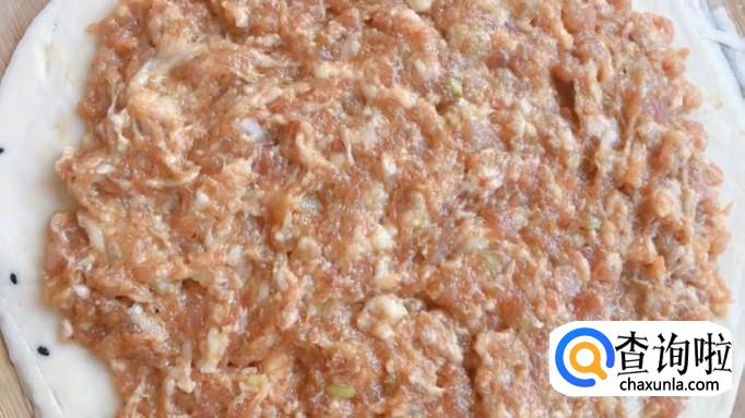 取出一张准备好的手抓饼,将调好味的肉馅涂抹在手抓饼上。