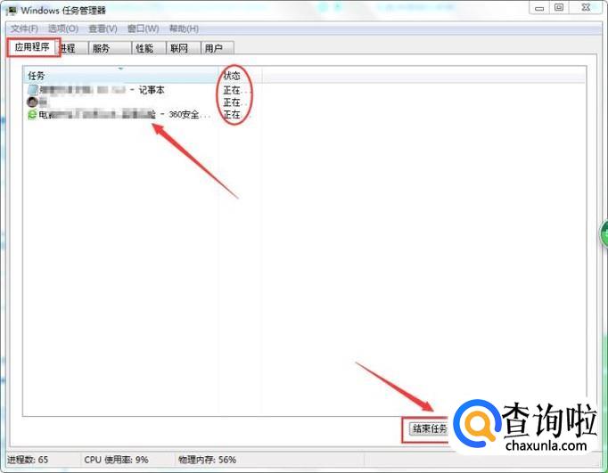 切换到【应用程序】选项卡,然后选中那些正在运行的进行,点击【结束进程】按钮,将这些进程关闭掉。