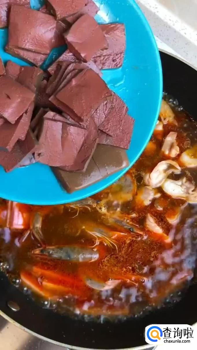 把买回来的鸭血清洗干净,切成薄片,倒入锅中煮一分钟,将所有食材捞出倒入碗中。小贴士:因为买回来的鸭血是已经煮熟过的,不宜汤太久否则会变得非常老,吃起来口感是非常差的,大家一定要注意控制好烫鸭血的时间。