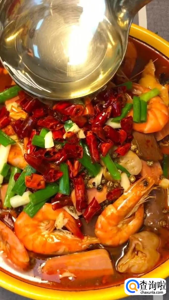接着把虾去除虾线,黑百叶切成薄片,肥肠切成薄片,香肠切成薄片,然后将这些材料一起倒入锅中煮三分钟,如下图所示。