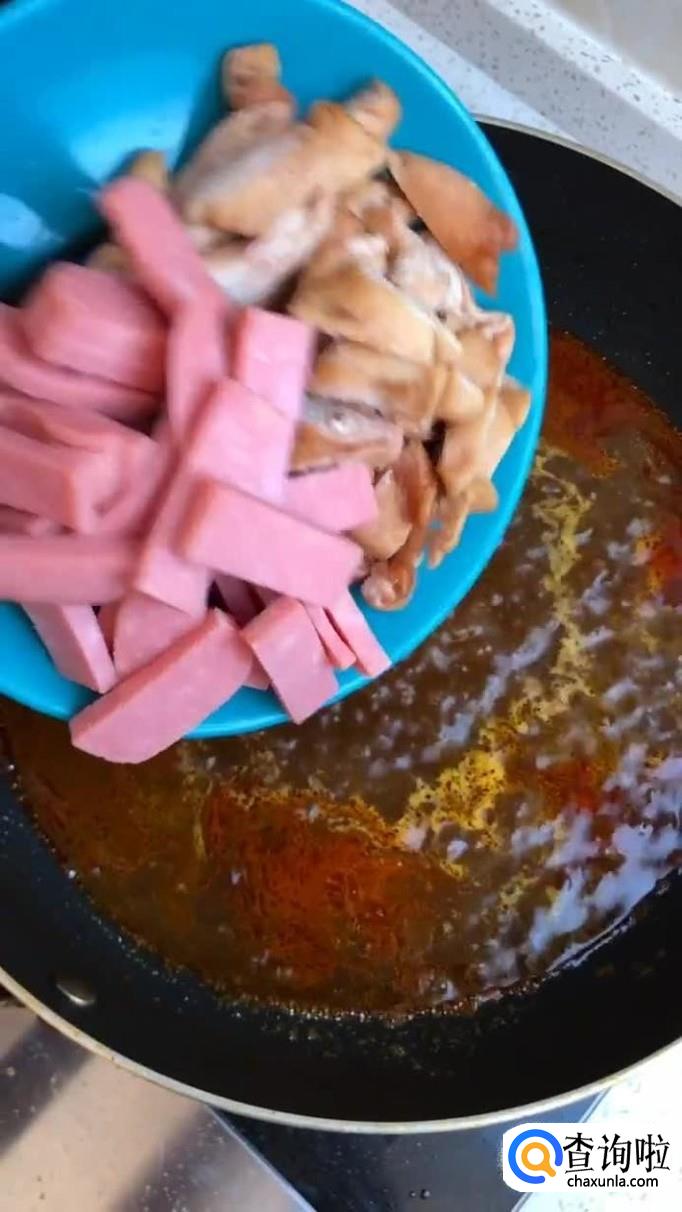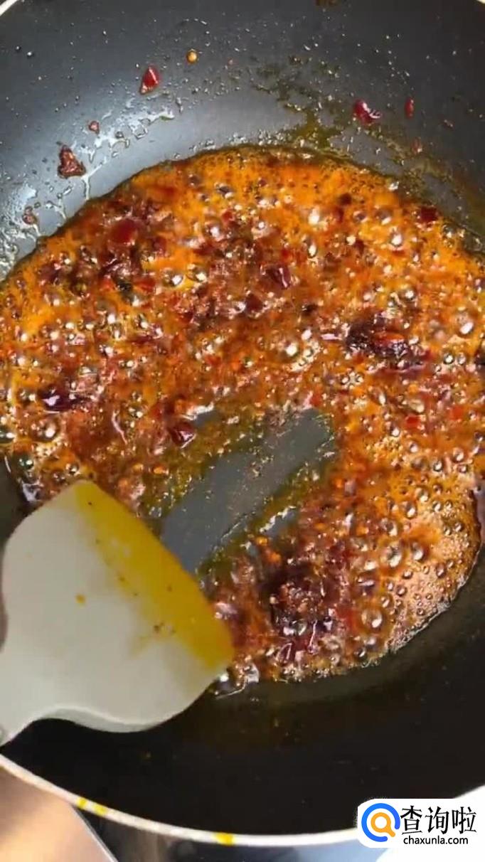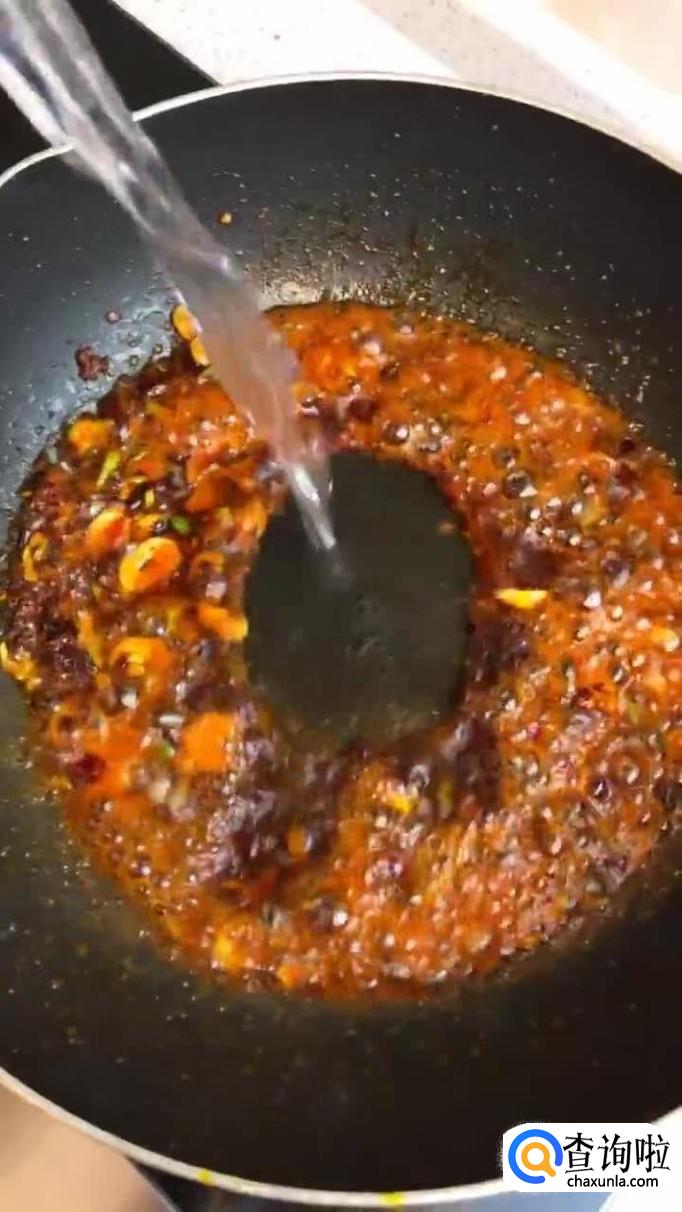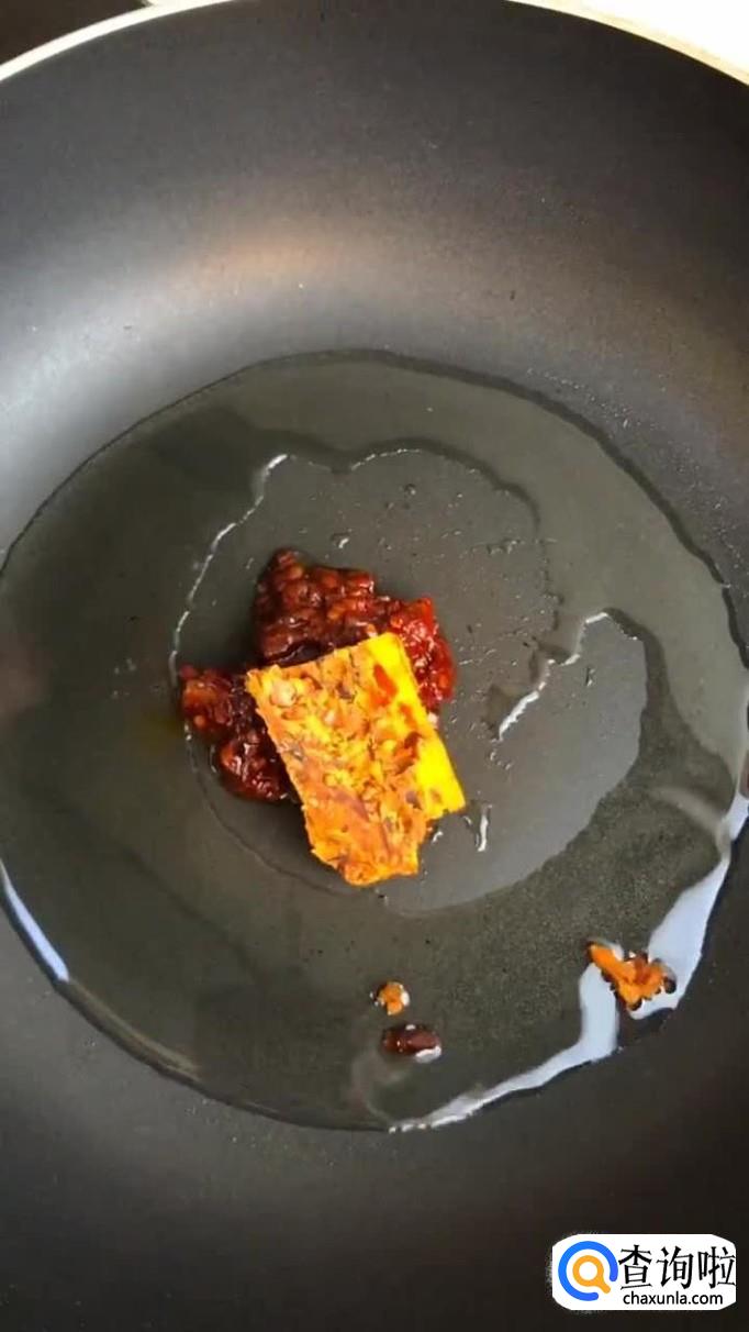 首先往锅中加入适量的食用油,待油烧至冒烟,倒入一勺的豆瓣酱和一小块的火锅底料抄匀,如下图所示。小贴士:如果你口味不是很重,可以将豆瓣酱和火锅底料用番茄酱和不辣的老干妈替代。这样的味道也是不错的,有兴趣的小伙伴可以尝试一下。