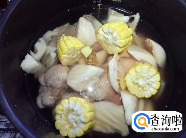 把所有材料,玉米、莲藕、筒骨、姜,一起放入锅里,放入适量的水。
