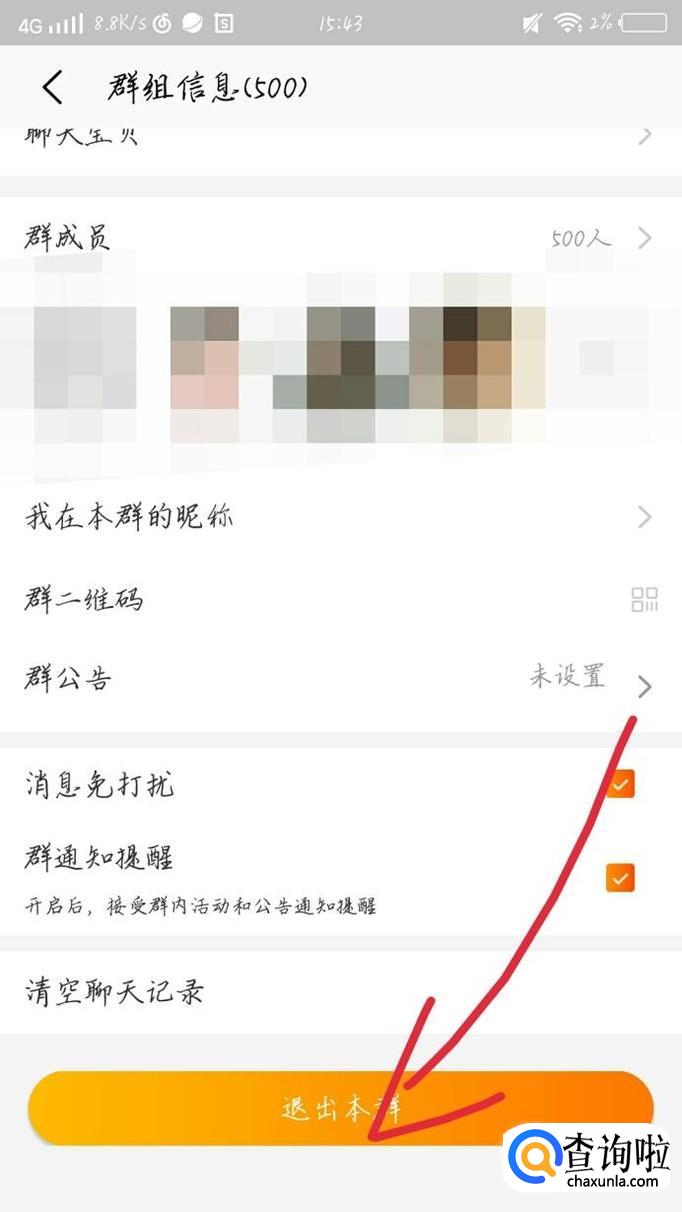 你会看到出现一个新的界面,向下滑动手机,你会看到出现一个新的界面,点击“退出本群”选项,如图1箭头所示。