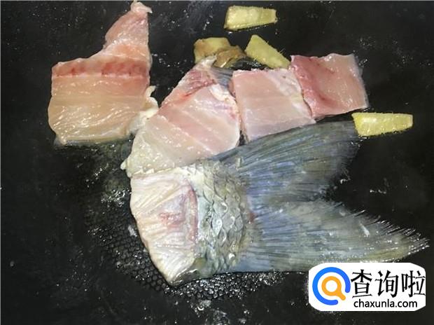 然后把鱼骨倒入锅中,小火慢慢煎三分钟。