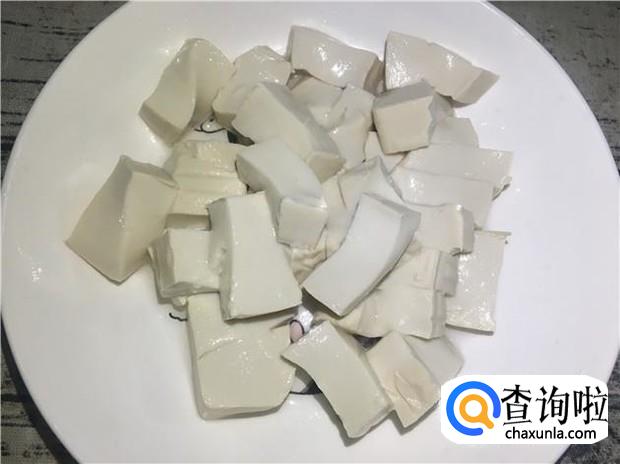 豆腐先用盐水泡一会,去掉豆腥味,然后切成小小块,备用。
