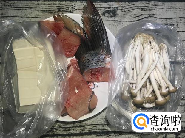 准备好所有原材料:鱼骨架一根、蟹味菇适量、嫩豆腐两小块。