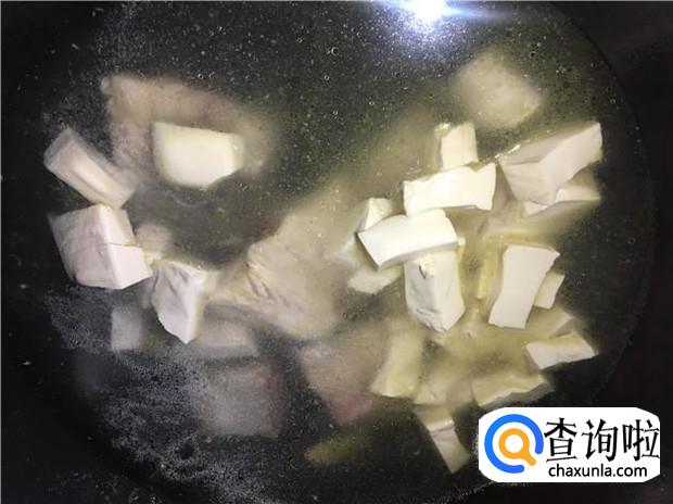 然后把豆腐丁也一起倒入锅中,豆腐要煮熟,没熟很容易拉肚子的。