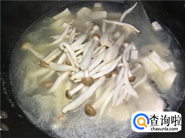 等到汤烧开后,再放入蟹味菇一起炖。