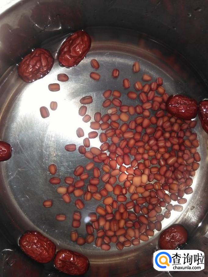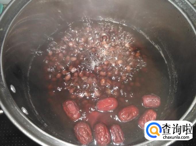 把泡好的红豆、红枣放进锅里,加3碗水,盖上盖子大火煮沸转小火。