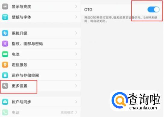 在更多设置里找到【OTG】一栏,开启OTG按钮开关,之后使用otg线连接即可,5分钟未使用,将自动关闭otg功能。