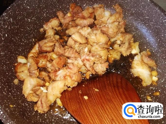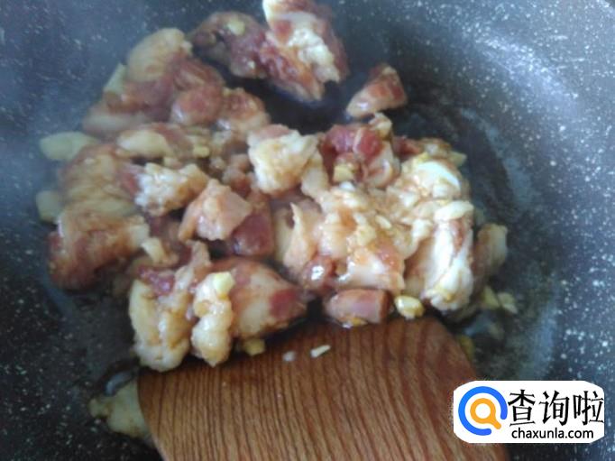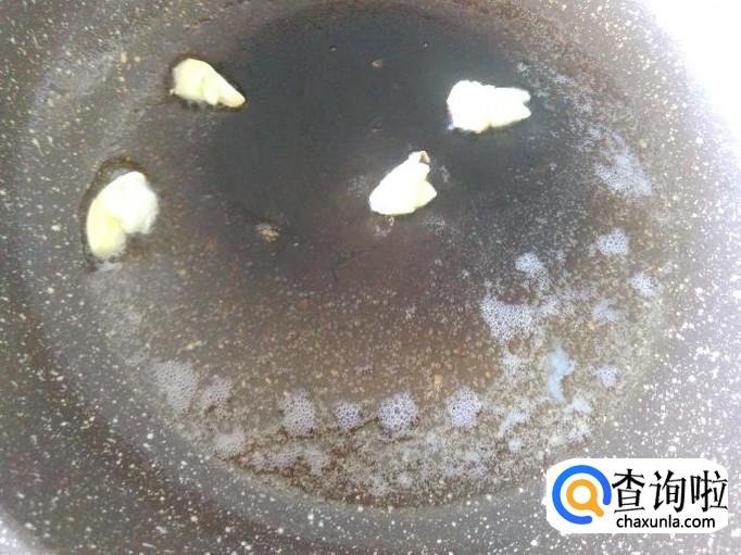 开火下油,放蒜米进去爆香,然后放猪肉进去翻炒。