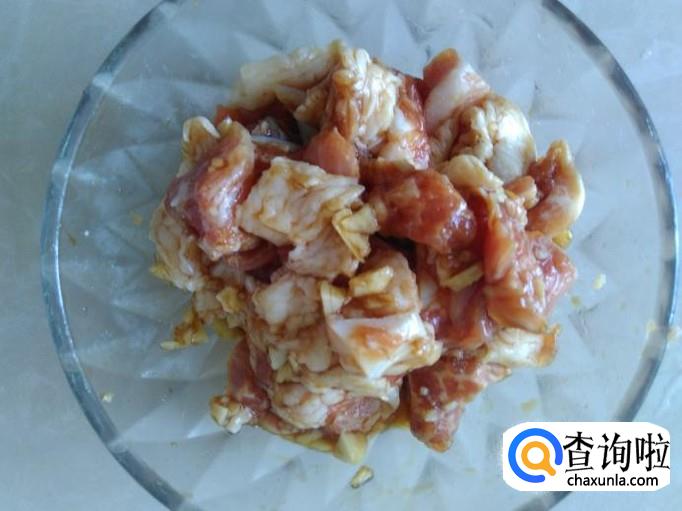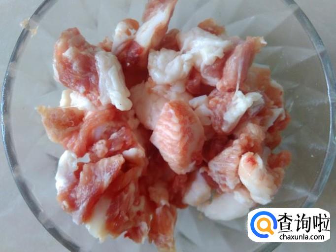 把半肥猪肉切成小丁,加适量的盐、姜蓉、1勺生抽、1勺料酒腌制几分钟。