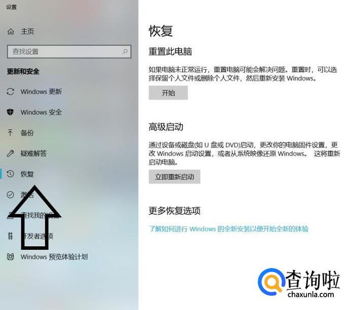 首先点击“开始”-“设置”-“更新与安全”-“恢复”,这样一步步点开!