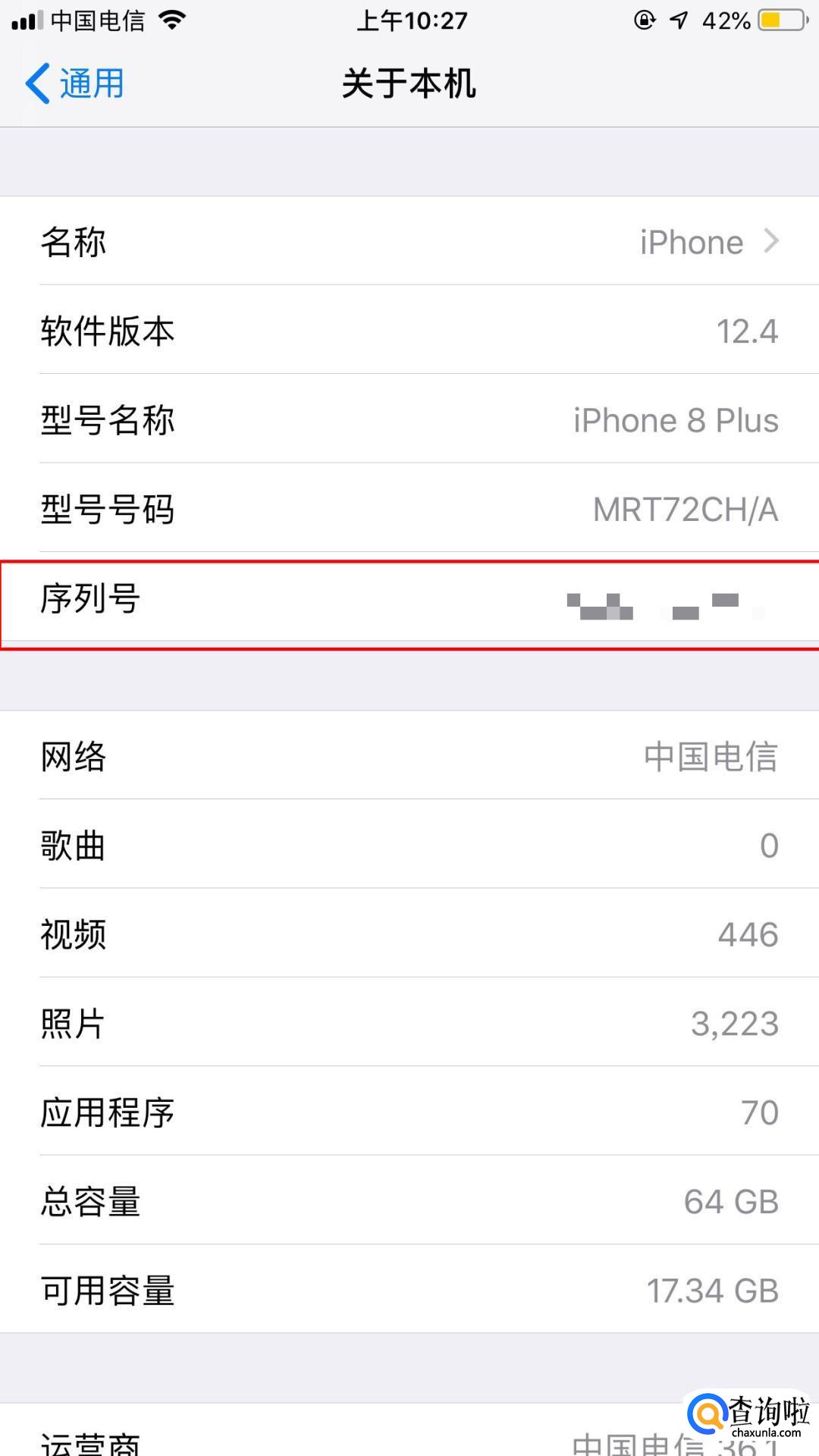 打开关于本机后可以看到iPhone手机的序列号,把这个序列号记下来。