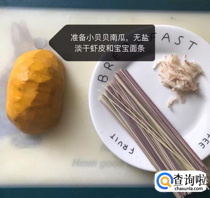 首先准备好南瓜,无盐淡干虾皮和宝宝面条,如下图所示。
