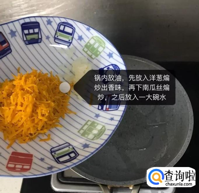 接着锅中放入适量的食用油,待油冒烟,先放入洋葱煸炒出香味,再下南瓜丝煸炒两分钟,加入一大碗的清水,如下图所示。