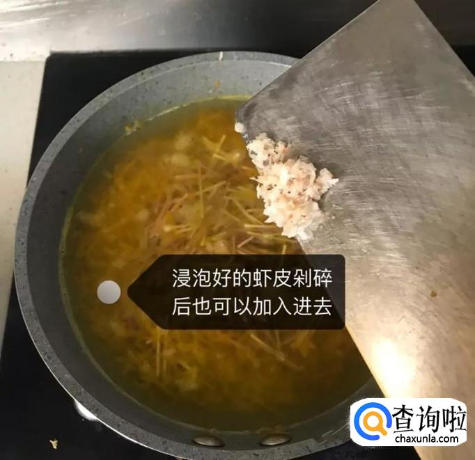 然后把浸泡好的虾皮剁碎下入锅中,如下图所示。