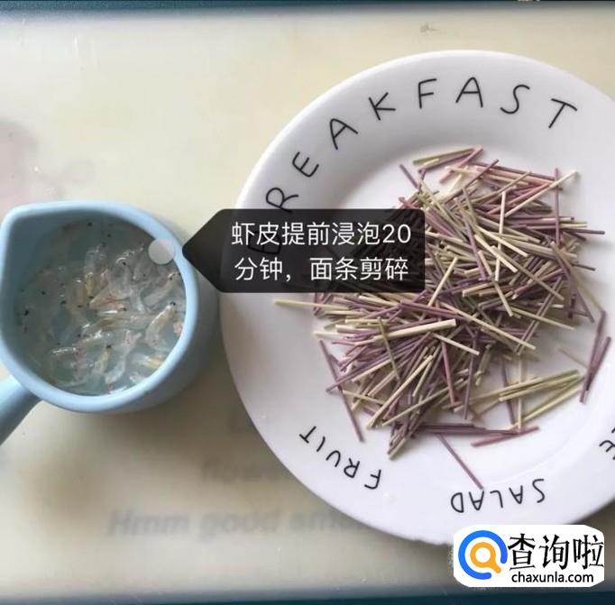 然后将虾皮提前浸泡20分钟,面条剪碎,如下图所示。