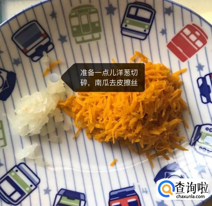 然后准备一些洋葱切碎,南瓜去皮擦丝,如下图所示。