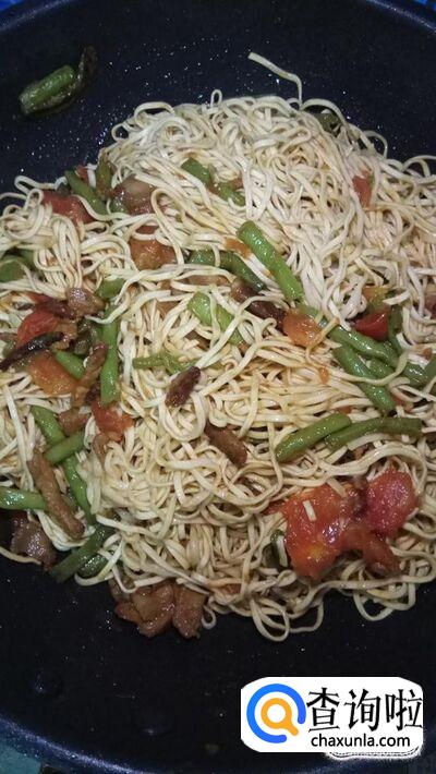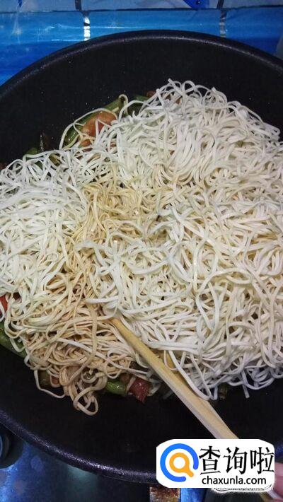 将蒸好的面条,放入锅中,和炒好的菜一起搅拌,让菜汤都裹在面条上。