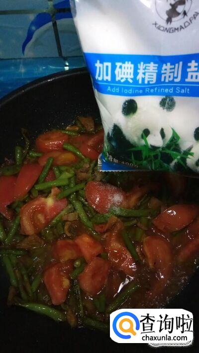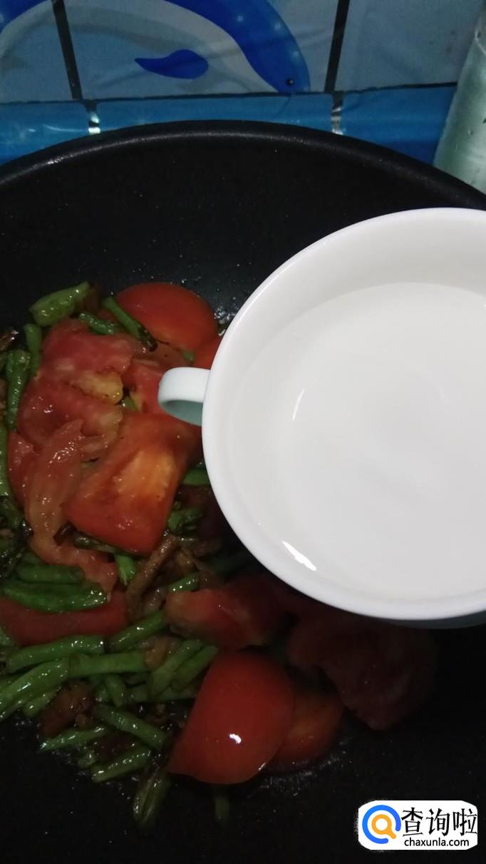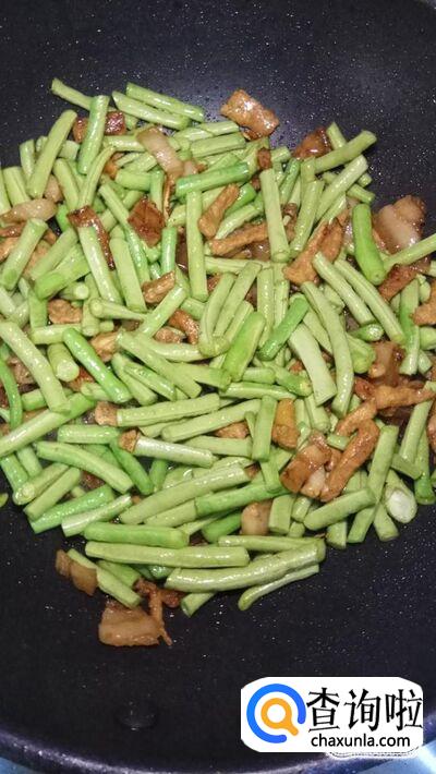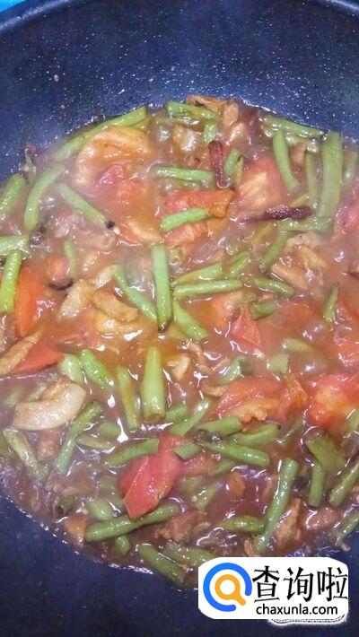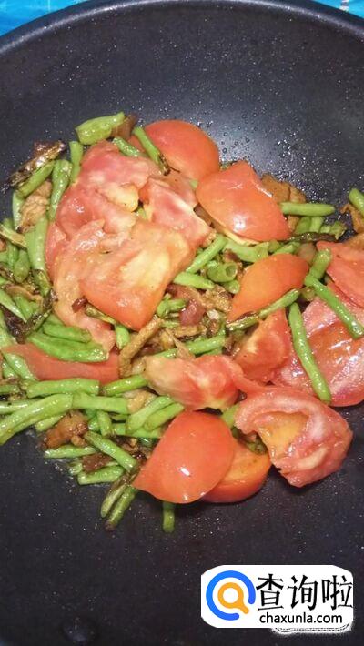 将豆角和西红柿放入锅中,和五花肉一起翻炒。