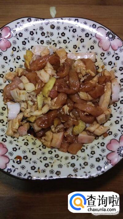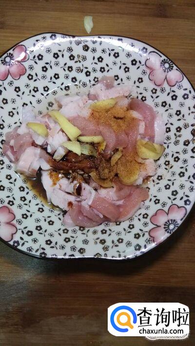 准备适量五花肉,放入适量料酒,生抽,姜,腌制20分钟。