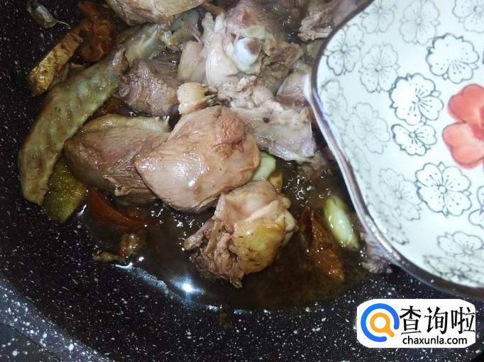 翻炒至鸭肉变色,然后加1勺生、1勺料酒翻炒一下,再下2小勺水进去。