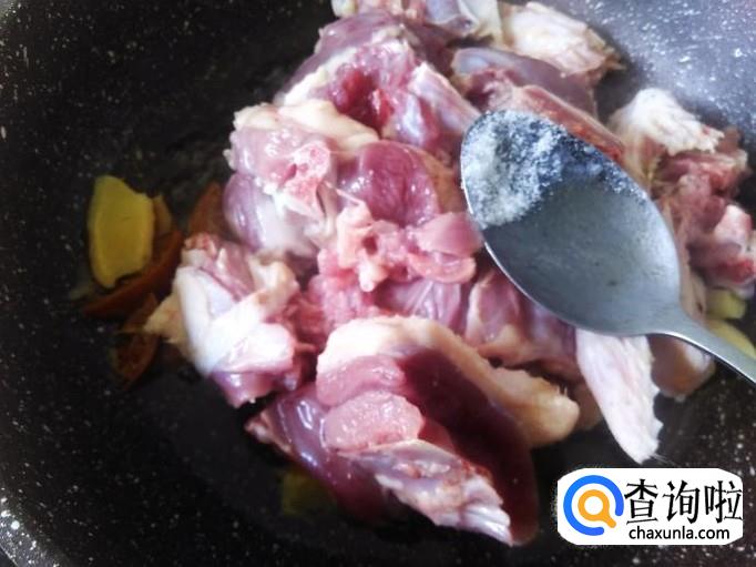 鸭肉下锅,加适量的盐翻炒。