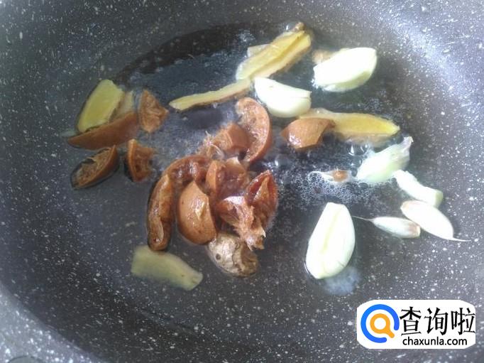 开火下油,把姜片、蒜米、柠檬放进去爆出味来。