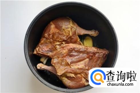 电饭锅或者电饭煲刷洗干净,把葱姜蒜八角放进去,然后把鸭腿放进去,最后倒一些白糖、食盐、生抽和料酒,按下蒸煮健就不用管了。
