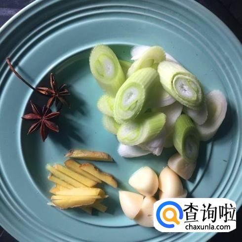 切一些生姜片,稍微多一些,做鸭腿的时候加上生姜片能够去掉腥气。准备一些葱段、大蒜瓣、八角。