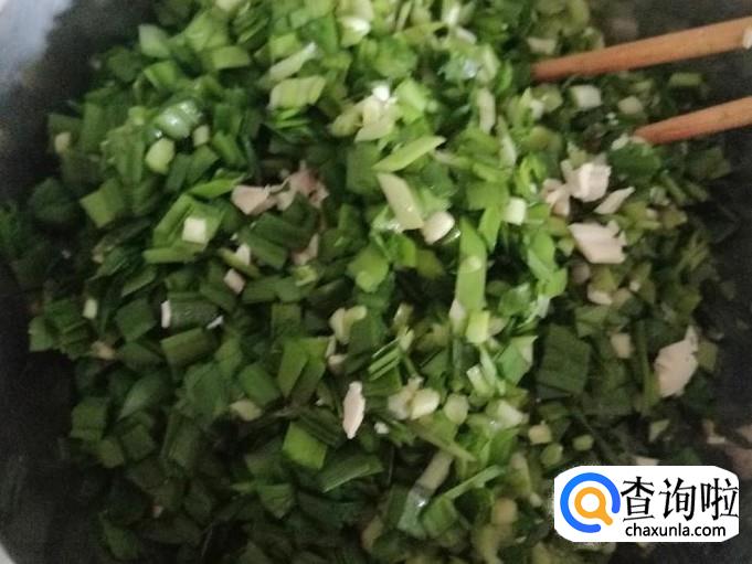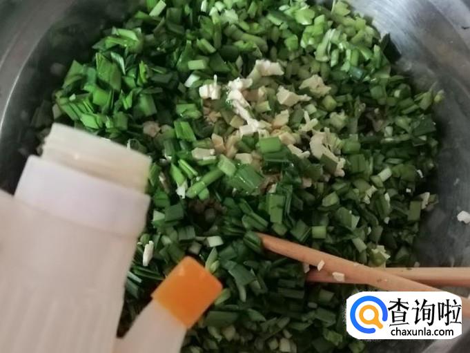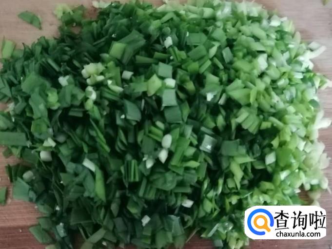 取适量新鲜的韭菜,摘掉韭菜根和黄叶子,用清水把韭菜洗净,最好用清水多泡一会,最后洗净切成韭菜末待用。