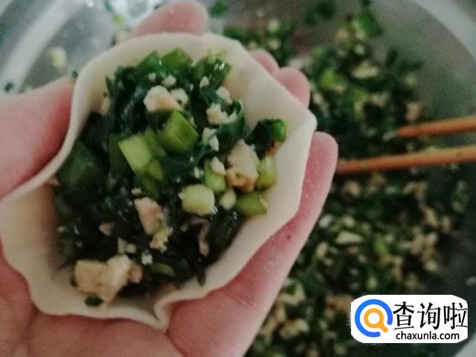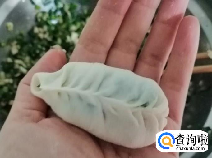 把和好的面搓长条下剂子,然后逐个擀成水饺皮,取出饺子皮,放入调好的素馅,从一头慢慢捏起,往左捏一下,然后往右捏,如图所示包好就可以了。