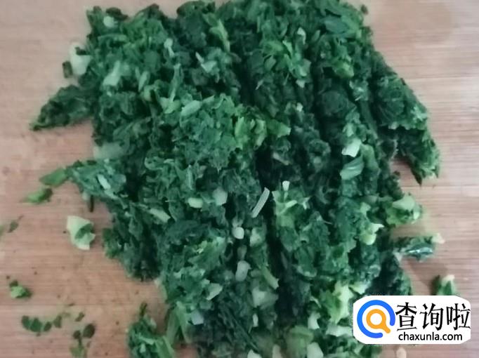 取适量新鲜的油菜,摘下油菜叶子部分做馅,杆部分可以用来炒菜,把油菜叶子用清水洗净,然后煮锅烧水,水开后把油菜叶子焯水,最后切末待用。