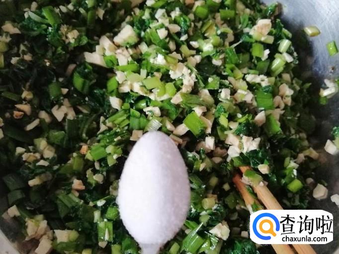 适量韭菜、油菜叶子、豆腐、虾皮、食盐、五香粉、香油