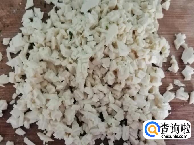 取适量新鲜的豆腐,用刀把豆腐切碎待用。如果不喜欢吃豆腐的,可以炒几个鸡蛋代替,把鸡蛋炒好切碎待用就可以。