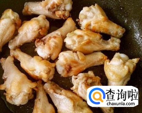 将小鸡腿蘸上干面粉,锅中放入少许油,将小鸡腿放入锅中煎一下,煎至金黄色捞出。