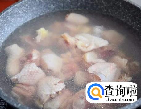 锅中坐开水,将小鸡腿放入开水中焯一下,去掉血水和浮沫,捞出控干。