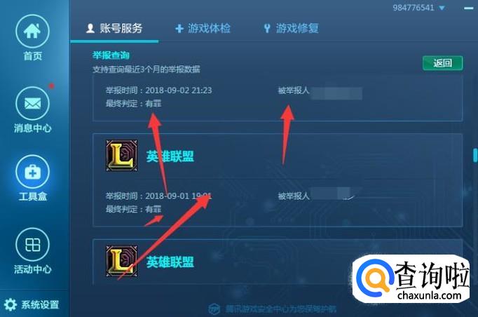 然后查看游戏的反馈记录如下图,然后就能看到结果了。都是你举报的人的信息情况