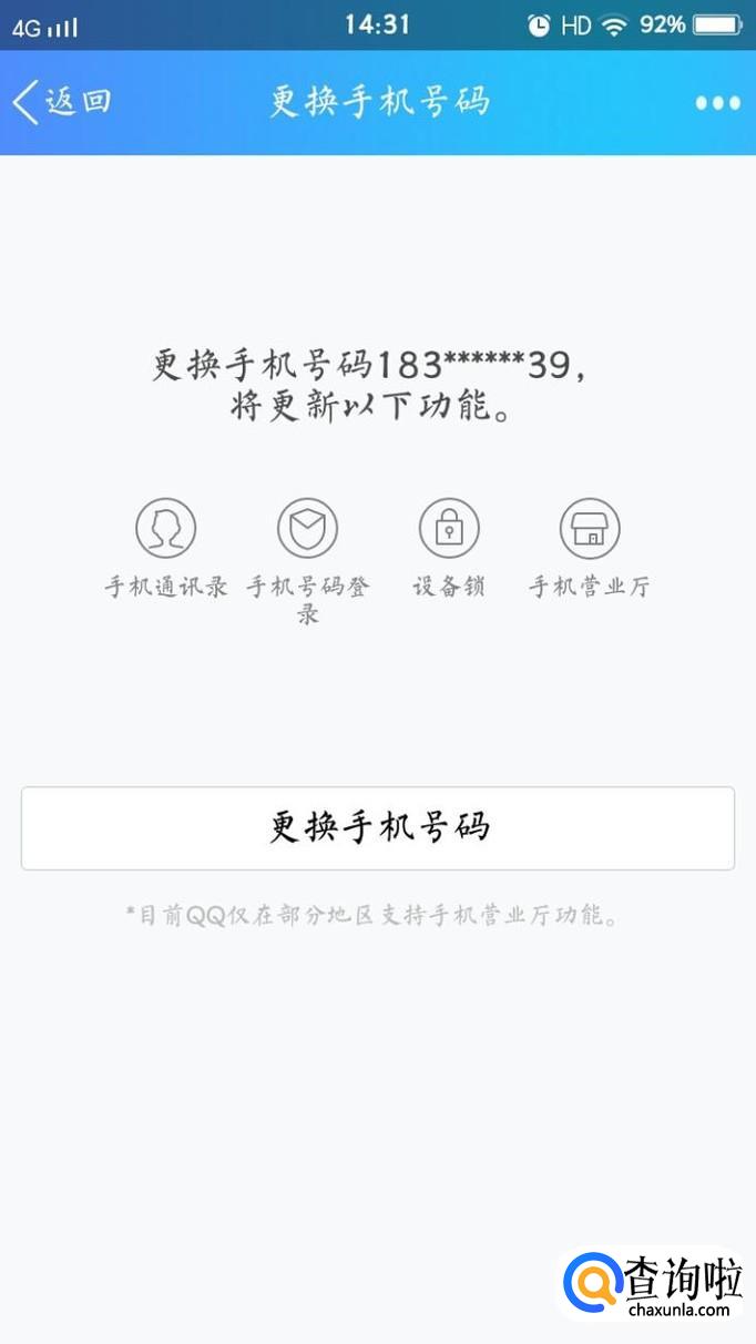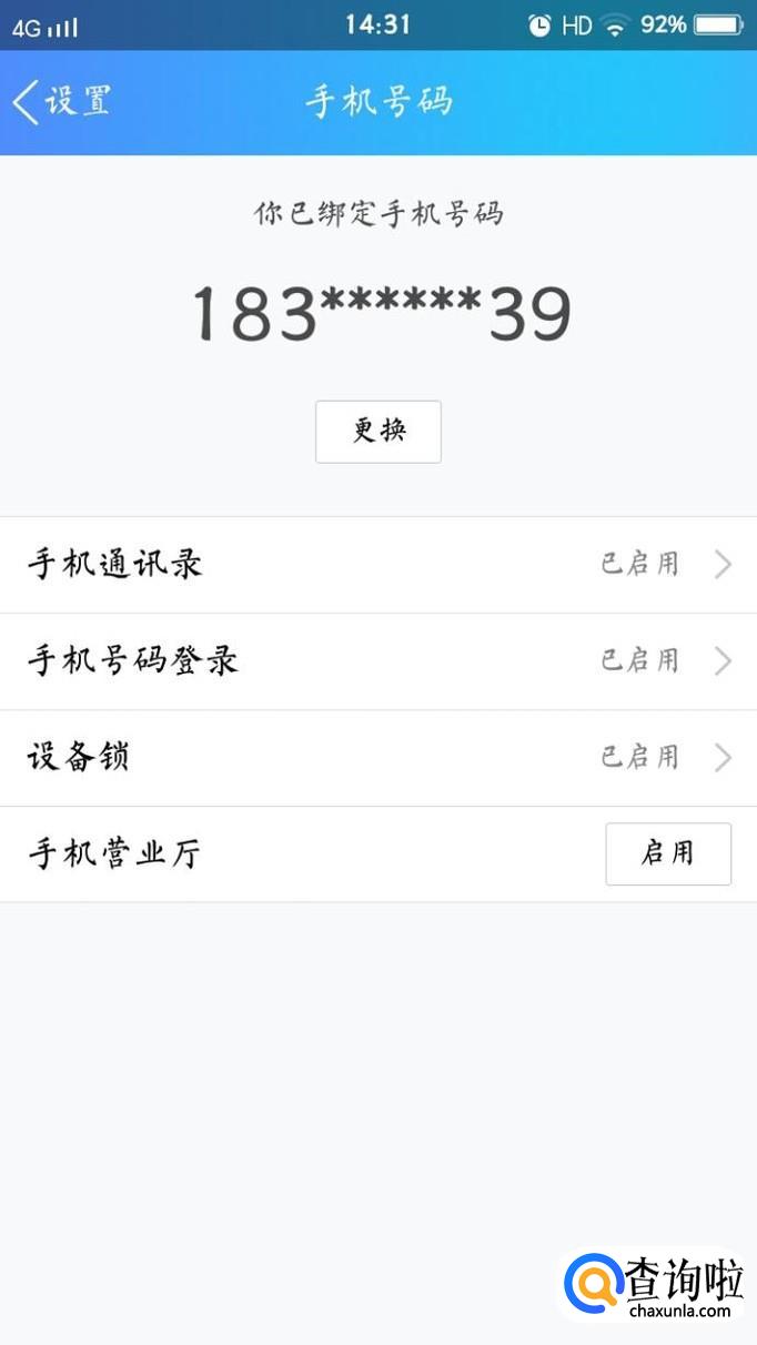 手机号码界面可以看到“更换”选项,点击进入