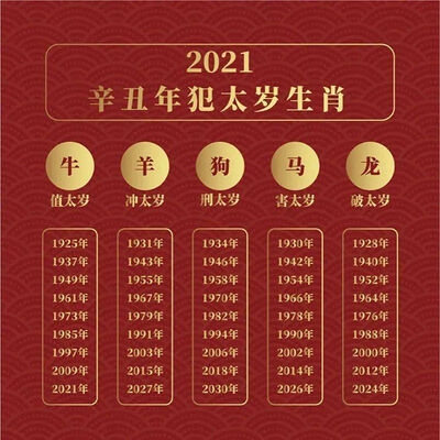 2021年犯太岁的生肖有龙、狗、马、羊、牛。太岁作为一种中国民间信仰,每年都有冲犯太岁的生肖,一个人的年庚,若与值年太岁相同,中国民间称为犯太岁,年庚对冲者,则叫冲太岁;诗曰:太岁当头坐,无喜恐有祸。